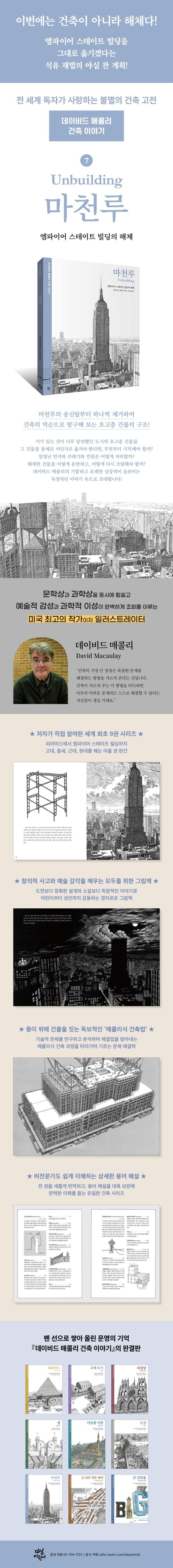《마천루》는 시리즈의 다른 권과는 구별되는 유머러스한 상상력이 돋보입니다. 예상치 못했던 결말은 미리 말할 수 없어 아쉬울 만큼 유머러스합니다. 해체가 진행되면서 도시의 경관도 조금씩 바뀌는 세밀화 일러스트도 인상적입니다. 만약 필름을 거꾸로 돌리듯이 책을 뒤에서부터 읽어 나간다면 마천루가 세워지는 과정을 단계별로 이해할 수 있을 것입니다. 데이비드 매콜리식 유머와 해체의 미학을 느끼고 싶다면 반드시 읽어야 할 책입니다.