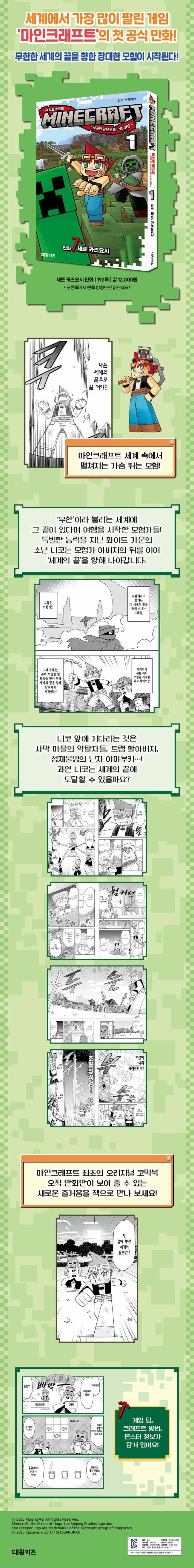 세계에서 가장 많이 팔린 게임 '마인크래프트'의 첫 공식 만화!무한한 세계의 끝을 향한 장대한 모험이 시작된다!상상하는 것은 무엇이든 만들 수 있는 게임 마인크래프트의 세계관을 박력 넘치는 액션과 감동적인 스토리로 그려 낸 오리지널 코믹북 『마인크래프트 세계의 끝으로 떠나는 여행』! 주인공 니코의 가슴 설레는 모험과 자유로운 크래프트 능력을 마음껏 즐겨 보세요.오른쪽에서 왼쪽 방향으로 읽으세요!"이것이 나의 크래프트(마인크래프트)다!"세상에서 가장 자유로운 게임, 만화로 다시 태어나다!블록을 하나씩 쌓아 올리며 자신만의 세계를 창조할 수 있는 자유! 이것이 전 세계적으로 사랑 받는 게임 마인크래프트의 가장 큰 매력입니다. 정해진 이야기를 따르지 않고, 플레이어가 상상하는 대로 탐험하고 생존하며 세계를 확장해 나가는 마인크래프트의 거대한 세계관이, 첫 공식 만화 『마인크래프트 세계의 끝으로 떠나는 여행』에 화려하게 펼쳐집니다!게임 속 친숙한 캐릭터와 아이템은 물론, 블록을 조합하듯 전개되는 독창적인 스토리와 눈을 뗄 수 없는 액션까지. 오직 만화만이 보여 줄 수 있는 새로운 즐거움을 책으로 만나 보세요!"나는 세계의 끝으로 갈 거야!!"마인크래프트 세계 속에서 펼쳐지는 가슴 뛰는 모험!'무한'이라 불리는 세계에 그 끝이 있다며 찾아나선 이들이 있습니다. 그들은 바로 '모험가'! 특별한 능력을 지닌 화이트 가문의 소년 니코는 모험가 아버지의 뒤를 이어 '세계의 끝'을 향해 나아갑니다. 여행 중에 좀비 모습의 도적 그레이를 만나 힘을 합쳐 사막 마을의 약탈자를 소탕하고, 트랩 할아버지의 함정을 벗어나는 등 험난한 모험을 시작하는데…! 과연 이들 앞에 어떤 일들이 기다리고 있을까요? 니코는 세계의 끝에 도달할 수 있을까요?니코의 창조적인 크래프트 능력과 숨막히는 액션, 순수한 모험가의 굳은 마음과 감동적인 우정 이야기가 흥미진진하게 이어집니다.새로운 방식으로 즐기는 마인크래프트『마인크래프트 세계의 끝으로 떠나는 여행』에는 게임 팁, 크래프트 방법, 몬스터 정보가 담겨 있어 마인크래프트를 좋아하는 독자들은 몰입하여 읽을 수 있고, 게임을 잘 몰라도 모험과 상상력을 사랑하는 독자라면 누구나 재미있게 즐길 수 있습니다.마인크래프트 최초의 오리지널 코믹북, 지금 만나 보세요!
