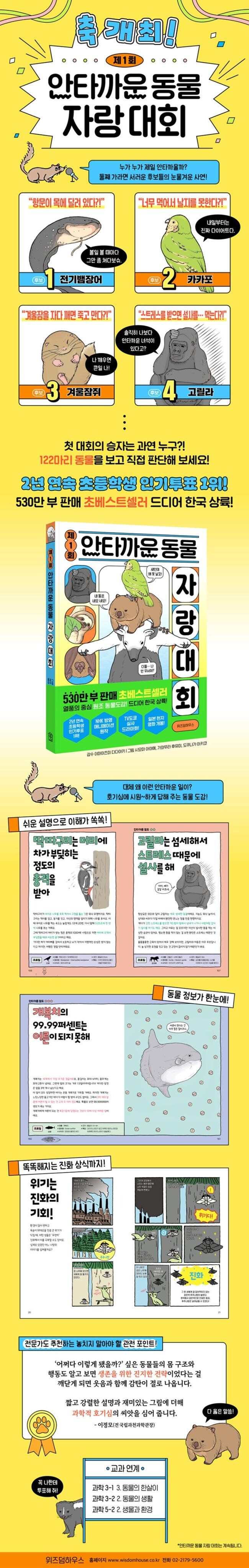 출간된 이래로 일본에서 530만 부 판매를 기록한 〈안타까운 동물 자랑 대회〉는 무려 2년 동안 초등학생 인기투표 1위를 차지했을 정도로 큰 사랑을 받은 초 인기 시리즈다. ‘웃기고 유익한 동물도감’의 열풍을 시작시킨 원조답게 특유의 유쾌함과 유익함으로 꽉 차 있는 덕분이다.