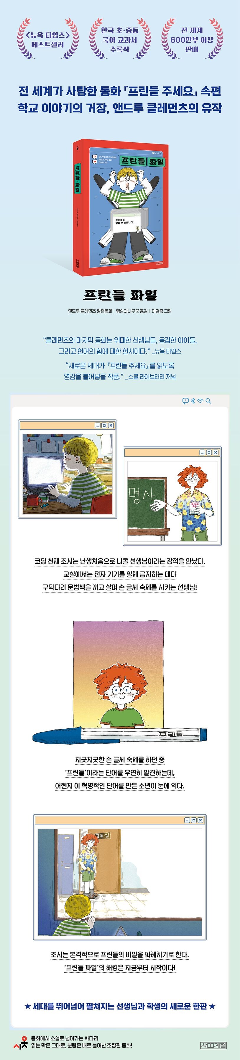 전 세계 독자가 사랑한 『프린들 주세요』의 후속작. 컴퓨터 코딩이 취미인 조시는 무엇이든 컴퓨터로 빠르고 간편하게 작업하는 걸 선호한다. 그런 조시가 새 학기에 이르러 만난 거대한 장벽이 있었으니, 바로 구닥다리 니콜 선생님이다. 전자 칠판, 노트북이 쓰이는 교실에서도 꿋꿋이 전자 기기를 허용하지 않고, 손 글씨 숙제를 제출하라는 선생님! 조시는 니콜 선생님의 숙제를 하던 중에 우연히 ‘프린들’이라는 단어와 그 단어를 만든 사람이 니콜 선생님과 비슷한 점이 많다는 것을 알게 되는데……. 조시는 그날부터 니콜 선생님의 비밀을 파헤치기로 결심한다. 수많은 것이 빠르게 변하는 시대에서도 절대 변치 않는, 선생님과 학생의 아름다운 관계가 새롭게 펼쳐진다!
