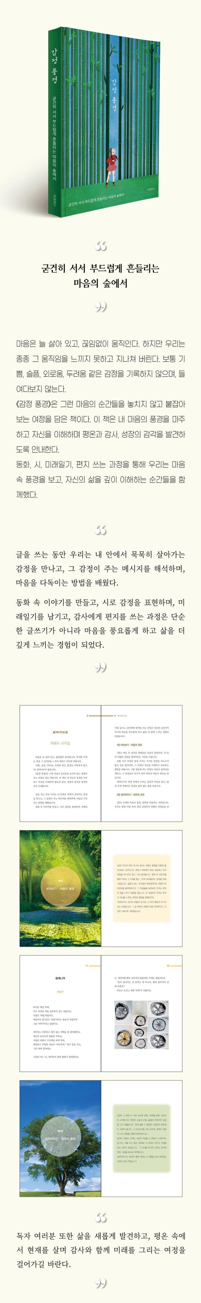 《감정 풍경》은 그런 마음의 순간들을 놓치지 않고 붙잡아 보는 여정을 담은 책이다. 이 책은 내 마음의 풍경을 마주하고 자신을 이해하며 평온과 감사, 성장의 감각을 발견하도록 안내한다.