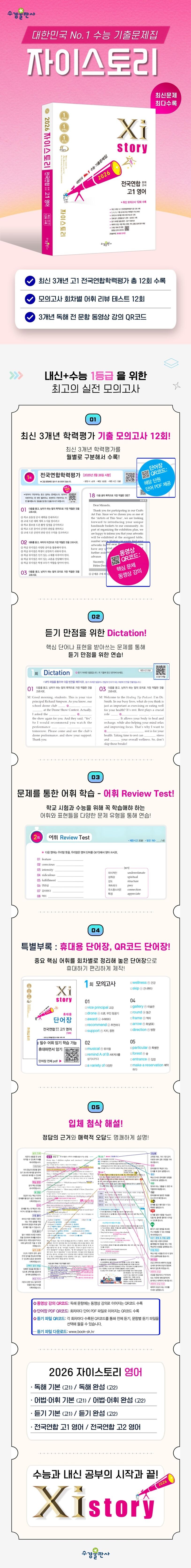 자이스토리는 수능 영어에 대비하기 위해 최신 3개년 전국연합학력평가 모의고사 12회분을 동일하게 수록하여 완벽한 수능 실전 훈련을 할 수 있도록 하였습니다. 듣기 영역의 딕테이션 배속 조절 유튜브 QR코드 파일과 독해 영역의 동영상 강의까지 제공하여 영어 1등급으로 가는 최고의 지름길을 안내합니다. 문제를 풀고 난 이후에는 정답의 근거와 오답 함정까지 알려주는 입체 첨삭 해설을 통해 모든 문제를 완전히 이해하면서 공부할 수 있습니다. 이 책의 마지막 페이지를 넘길 때쯤 여러분은 이미 영어 1등급에 도달해 있을 것입니다.