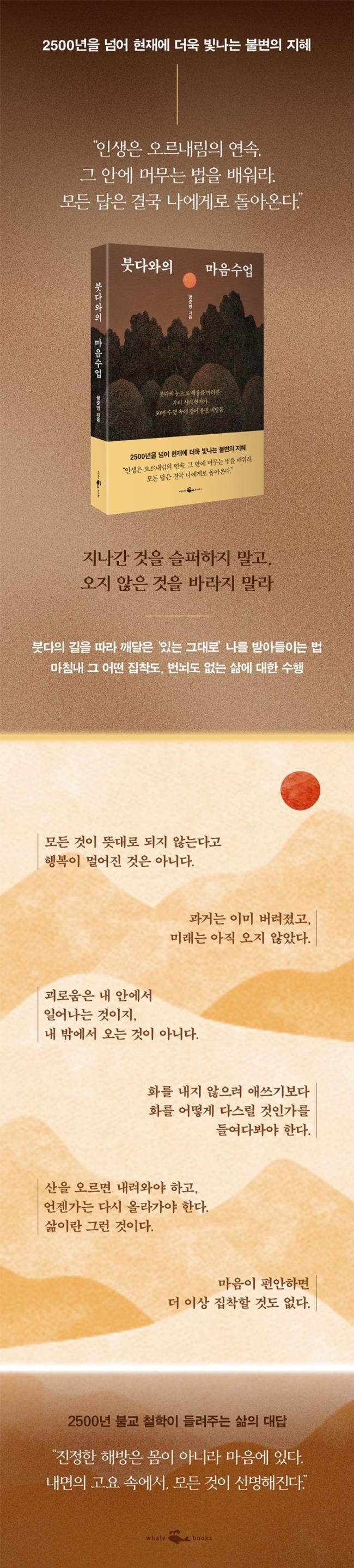 『붓다와의 마음수업』은 분노와 괴로움, 욕망과 집착으로 흔들리는 우리 모두에게 건네는 마음 안내서다. 저자는 수행의 현장에서 얻은 통찰을 통해 요동치는 감정 속에서도 평온을 얻는 방법을 전한다. 이 책을 통해 우리는 삶의 무게와 감정의 파도에서도 스스로의 마음을 살피고, 그 속에서 조금 더 단단하고 고요한 평화를 얻게 될 것이다.
