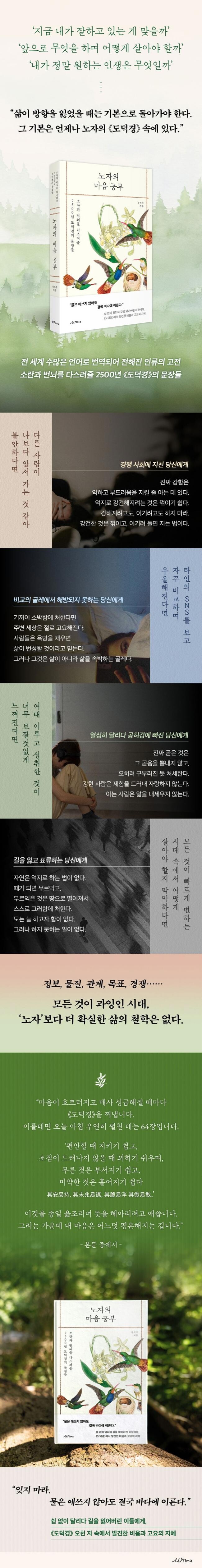 그로부터 약 2500년이 지난 오늘, 우리는 물질과 정보의 과잉 속을 살아간다. 노자는 이미 아주 오래 전에 ‘더 많이’, ‘더 빨리’의 욕망이 불러올 피로와 공허를 간파했다. 그는 더 많이 가지려 하거나 통제하려는 마음을 내려놓고, 내면의 고요 속에서 삶의 본래 질서를 회복해야 한다고 말한다. 자연은 애쓰지 않아도 제 길을 가고, 물은 결국 바다에 이르며, 숲은 저절로 푸르러진다. 인위적 힘을 보태지 않는 ‘무위자연(無爲自然)’의 자세가 올바른 삶이며, 성취만으로는 채워지지 않는 공허를 메우는 길이라는 것이다. 그래서 오늘의 우리에게 《도덕경》은 어렵고 딱딱한 이론서가 아닌 삶의 해설서처럼 곁에 두고 자주 펼쳐 볼 책이 된다.