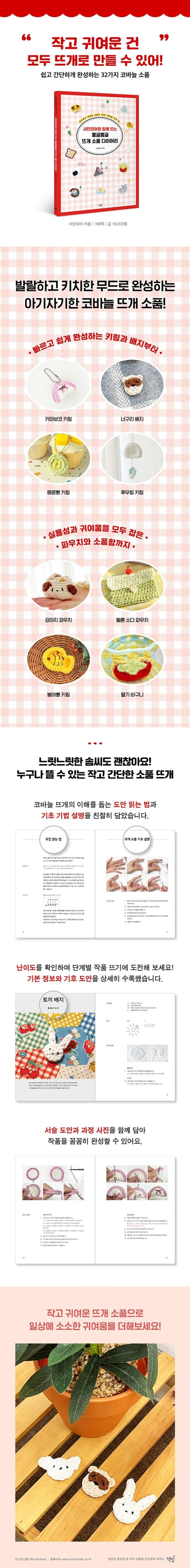 누구나 취향에 맞는 뜨개를 시작할 수 있도록 키링과 티코스터, 파우치와 소품함까지 다양한 작품을 실었으며, 하나의 도안으로 키링이나 배지를 만들 수 있게끔 뜨개 기초 설명에서 만드는 법을 자세히 설명했습니다. 하나의 도안으로 여러 가지 뜨개 소품을 만드는 일석이조의 기쁨을 찾아보세요!