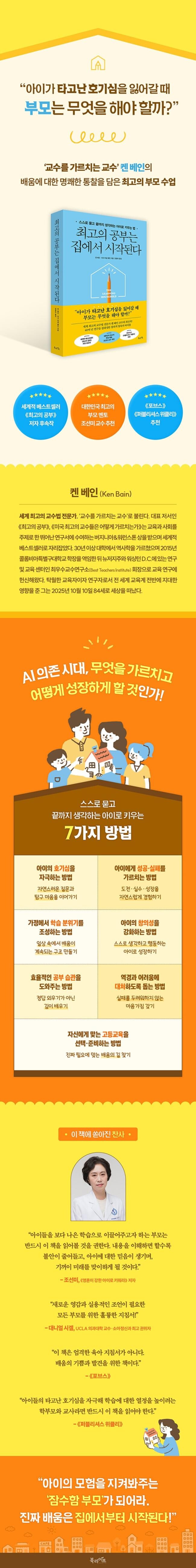 저자인 켄 베인 교수는 인간은 태어날 때부터 자연적 호기심을 본성으로 지닌 학습자라 강조하며, 이 타고난 배움의 추진력이 억압되느냐, 확장되느냐가 아이 인생 전반의 학습 태도와 사고방식을 결정한다고 밝힌다. 이러한 관점은 세계 최고의 교육열을 자랑하는 한국 부모들에게 시사하는 바가 크다. 요즘 아이들은 수업 시간에 질문을 거의 하지 않는다. 서로 질문하며 생각을 나누고 토론하며 배우는 게 아니라 일방적인 가르침이 주된 교육 방식이었기 때문이다. 하지만 정답만 외워서는 아이의 미래 역량을 키울 수 없다. 아이들이 가진 배움의 불씨가 꺼지지 않도록 ‘어떤 공부를 시켜야 하는가’보다 먼저 ‘아이의 질문과 관심이 어디를 향해 있는가’를 살피는 기준 전환이 필요하다.