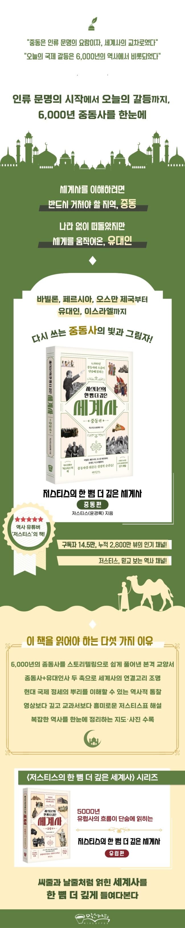 구독자 15.4만의 역사 유튜브 ‘저스티스’는 지난 2019년에 시작되어 6년여 동안 약 500개의 영상을 올리며 천천히 그리고 우직하게 역사의 결정적 사건, 순간, 장면들을 전하고 있다. 다루지 않은 곳을 찾기 힘들 정도로 유럽, 중동, 중국, 일본, 미국, 유목민, 동남아시아의 역사까지 세세하게 다뤘다. 이번 책에서 다룰 지역은 ‘중동’으로 ‘중동을 모르고는 세계사를 이해할 수 없다’고 말할 수 있을 정도로 그 중요도가 출중하다 하겠다.