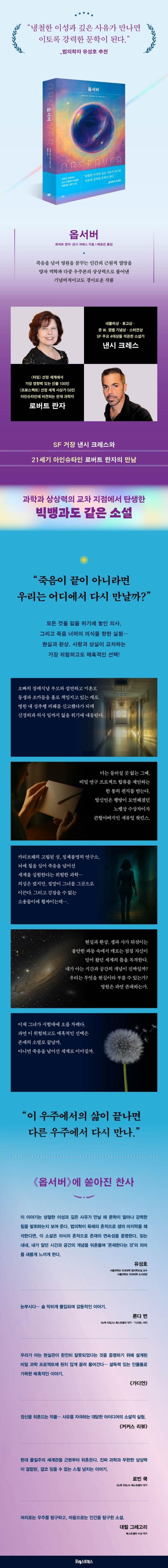 『옵서버』의 독창성은 과학적 개념을 단순한 서사 장치로 차용하는 데 그치지 않는다. “관찰자가 관찰하기 전까지 세계는 존재하지 않는다”라는 양자 역학의 근본 원리에 다중 우주론의 상상력을 더해, 삶과 죽음이라는 필멸의 조건 속에서 인간이 오래도록 품어온 열망, 즉 죽음을 넘어선 경험을 문학적 성취로 끌어올린 데 있다.