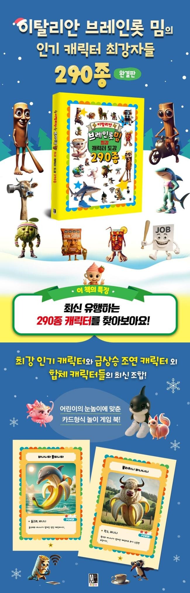 「이탈리안 브레인롯 밈 최강 캐릭터 도감 290종」은 최강 인기 캐릭터와 급상승 조연 캐릭터 등 다양한 캐릭터 290종을 모아 보기 편한 도감 형식으로 만들었습니다. 각각의 캐릭터마다 〈구성요소〉 와 〈특징〉 등 상세 정보를 담아 친구들과 즐겁게 이름 맞히기 게임도 할 수 있습니다.