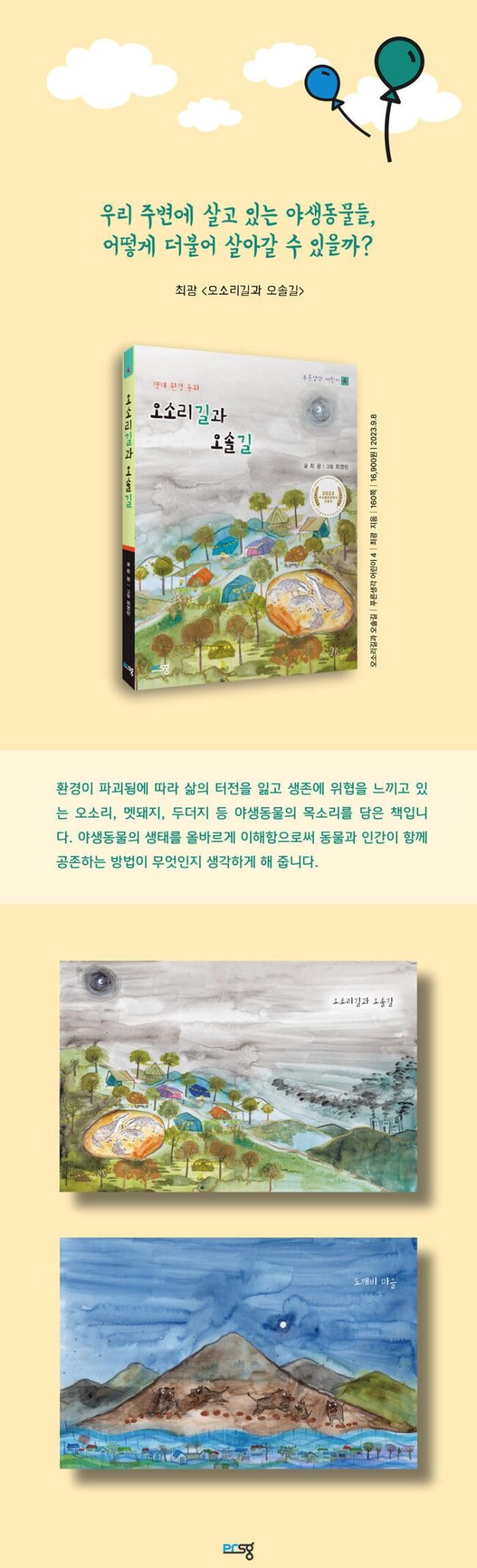 최광 작가의 생태 환경 동화 『오소리길과 오솔길』에는 우리 곁에 가까이 사는 야생동물인 오소리, 멧돼지, 토끼, 두더지 등이 주인공으로 등장합니다. 아름다웠던 우리 별 지구는 점점 환경이 오염되고, 홍수와 산불 같은 재난이 끊임없이 일어나는, 유례 없는 기후 변화 위기에 처해 있습니다. 사람들은 야생동물이 오랫동안 일구어 온 삶의 터전을 야금야금 빼앗아 구석으로 내몰고 있고요. 최광 작가는 살 곳을 잃어 가는 야생동물의 처지를 어린이들이 이해하고 공감할 수 있기를 바라는 마음으로 이 책을 펴냈습니다.