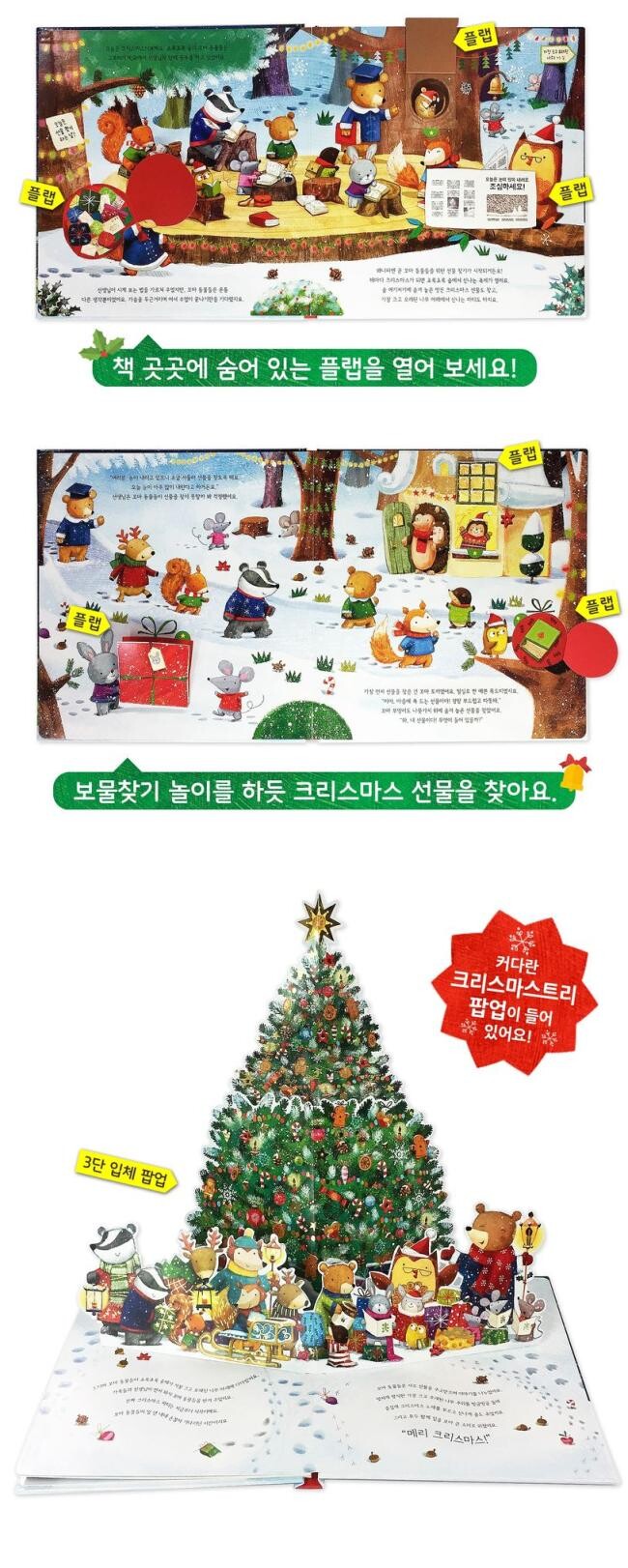 《즐거운 크리스마스 선물 찾기》에는 커다란 크리스마스트리 팝업이 들어 있어요. 꼬마 동물들과 같이 크리스마스 파티 장소로 가 보세요. 초록초록 숲에서 가장 크고 오래된 나무로 꾸민 화려한 크리스마스트리 팝업이 나타날 거예요. 나무 꼭대기에 달린 커다란 별과 반짝이는 전구볼, 예쁜 솔방울과 도토리는 물론이고, 아이들이 좋아하는 쿠키와 사탕이 주렁주렁 매달려 있답니다. 거실 탁자 위에 커다란