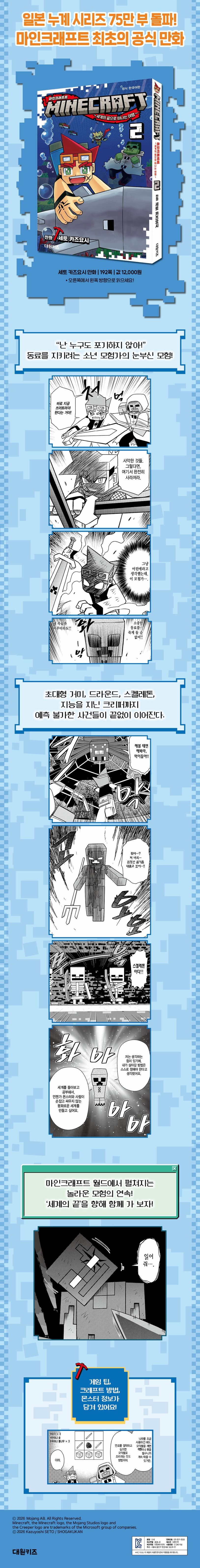 “이것이 나의(mine) 크래프트(craft)다!”세계 최고의 게임 마인크래프트, 이제 만화로 즐기자!정해진 이야기를 따르지 않고, 플레이어가 상상하는 대로 탐험·생존하며 세계를 확장해 나갈 수 있어 큰 인기를 끌고 있는 게임 마인크래프트. 이 게임의 거대한 세계관이 놀라운 액션 모험 코믹으로 새롭게 탄생했습니다.마인크래프트의 유일한 공식 만화 『마인크래프트 세계의 끝으로 떠나는 여행』은 일본에서 75만 부 판매를 돌파한 인기 시리즈로, 몰입감 넘치는 스토리와 화려한 액션은 물론, 게임 팁, 크래프트 방법, 몬스터 정보까지 담고 있어 마인크래프트를 좋아하는 사람이라면 누구나 즐겁게 읽을 수 있습니다.“난 누구도 포기하지 않아!”동료를 지키려는 소년 모험가의 눈부신 모험!‘무한’이라 불리는 세계에 그 끝이 있다고 믿으며 여행을 떠난 ‘모험가’! 특별한 능력을 지닌 화이트 가문의 소년 ‘니코’는 모험가였던 아버지를 따라 ‘세계의 끝’을 향해 나아갑니다.좀비 모습의 도적 그레이, 쌍검술사 야마부키와 함께 이번에는 숲을 위협하는 초대형 거미 몬스터, 슬픈 사연을 간직한 드라운드, 규정을 목숨처럼 여기는 족장을 만나 험난한 모험을 이어가는데…. 그 끝에서 만난 것은 지능이 있어 말을 할 수 있는 소형 크리퍼?!과연 니코와 친구들 앞에 어떤 일들이 기다리고 있을까요? 니코는 세계의 끝에 도달할 수 있을까요?니코의 창의적인 크래프트 능력과 숨 막히는 액션, 순수한 모험가의 굳은 마음과 감동적인 우정 이야기가 흥미진진하게 펼쳐집니다.