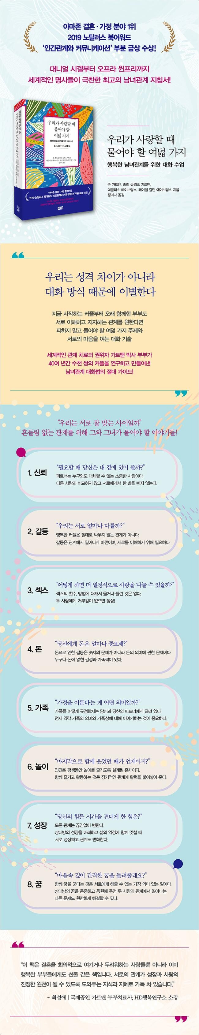 이 책은 최신 심리학, 사회학, 의학 등 다양한 연구결과와 실제 수많은 커플의 상담 사례를 바탕으로 커플들의 고민을 파악하고, 갈등의 원인을 짚고, 그 갈등을 관리할 수 있는 대화법과 경청의 노하우를 과학적으로 제시하고 있다.