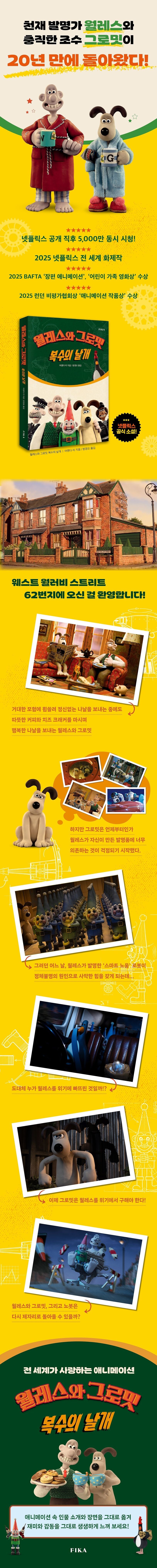 책장에 꽂아두는 것만으로도 하나의 작품이 되는 이 도서는, 월레스와 그로밋의 팬이라면 반드시 소장해야 할 최고의 아트북이자 소설로서 그 가치를 증명할 것이다.