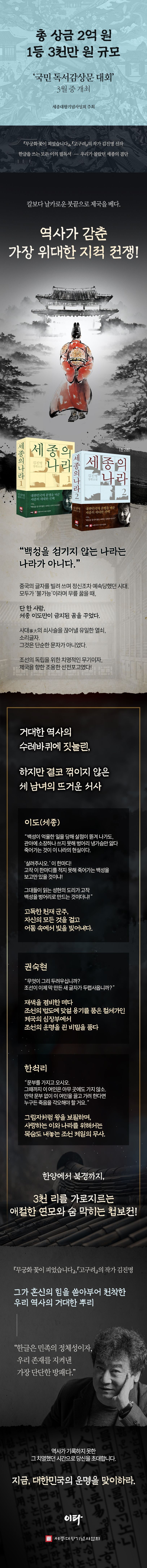 지금 이 순간에도 우리는 한글로 생각하고, 한글로 소통하며 살아간다. 『세종의 나라』는 500년 전 가장 고독했던 왕의 위대한 선택이 오늘날 우리에게 어떤 의미를 갖는지 되새기게 하는, 대한민국 국민이라면 꼭 읽어야 할 필독서다.