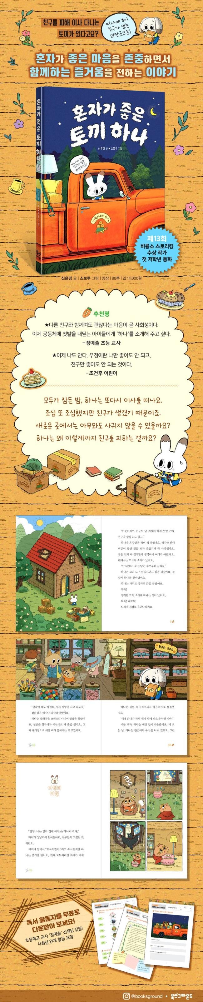 《혼자가 좋은 토끼 하나》는 ‘친구를 피해 이사 다니는 토끼’라는 독특한 설정으로 독자들의 호기심을 끌어당긴다. 제13회 비룡소 스토리킹 대상을 수상한 신은경 작가의 첫 번째 저학년 동화로, 이제껏 보지 못한 캐릭터와 이야기를 선보인다. 이 작품은 친구를 ‘반드시 사귀어야 하는 대상’이라고 말하는 대신, ‘혼자가 좋은 마음’을 존중하면서 시작한다. 그리고 누군가와 함께할 때 어떤 즐거움이 있는지를 하나의 경험을 통해 자연스럽게 보여 준다.