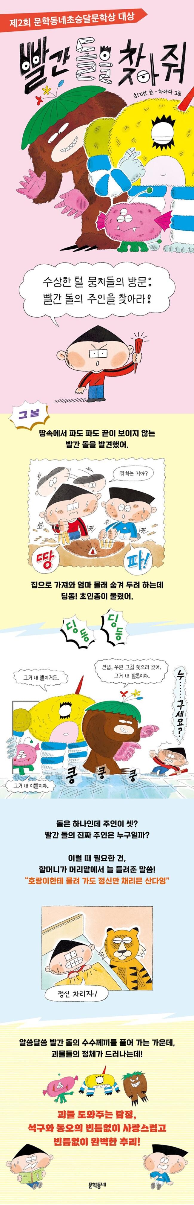 미스터리한 물건의 정체, 첫눈엔 악당인 줄 알았지만 알고 보면 귀여운 괴물들, 번뜩이는 추리와 허를 찌르는 반전……. 아이들을 사로잡을 소재들로 꽉 채운 저학년 동화 『빨간 돌을 찾아 줘』가 출간되었다. “나 자신과 세계에 대한 믿음이 굳건한 어린이”들이 “자신의 경험과 직관의 힘으로 진실을 탐구하는” 이 건강한 이야기는 심사위원들의 열렬한 환호를 끌어내며, 『친절한 땅콩 호텔』과 함께 제2회 문학동네초승달문학상 대상을 수상했다. 문학동네초승달문학상은 저학년 독자의 특성에 맞춤한 작품을 발굴하기 위해 신설한 공모전으로, 첫해 대상 수상작 『해든 분식』과 제2회 대상 수상작 『친절한 땅콩 호텔』을 연이어 출간하며 독자와 평단의 사랑과 주목을 받고 있다. 닭강정으로 변한 분식집 딸 강정인의 위기(『해든 분식』), 아무도 없는 호텔에 손님과 둘만 남게 된 내향성 직원 ‘너츠’의 위기(『친절한 땅콩 호텔』)에 이어 이번 『빨간 돌을 찾아 줘』에서는 어떤 인물들이 어떤 위기를 몰고 우리를 찾아올까? 귀엽고도 진땀 나는 위기를 슬기롭게 풀어 나가는 석구와 동오. 이제부터 여러분도 탐정. 석구와 동오와 함께 이 문제를 해결해 볼까?