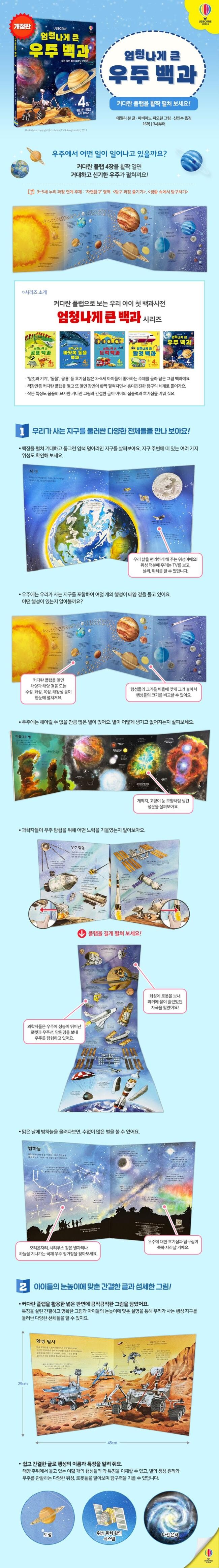 우주에는 우리가 사는 지구를 포함하여 여덟 개의 행성이 태양 곁을 돌고 있어요. 또 우주를 탐험하기 위한 우주 망원경, 국제 우주 정거장, 소유스호 우주선 등이 있지요. 책장을 펼쳐 거대하고 둥그런 암석 덩어리인 지구를 살펴보아요. 지구 주변에 떠 있는 여러 가지 위성도 확인해 보세요. 이들 덕분에 우리는 TV를 보고, 날씨, 위치를 알 수 있답니다. 그다음 커다란 플랩을 열면 태양과 태양 곁을 도는 수성, 화성, 목성, 해왕성 등이 한눈에 펼쳐져요. 행성들의 크기를 비율에 맞게 그려 놓아서 행성들의 크기를 비교할 수 있지요. 또한 우주에는 헤아릴 수 없을 만큼 많은 별이 있어요. 별이 어떻게 생기고 없어지는지, 지구는 어느 은하에 속해 있는지 살펴보세요.