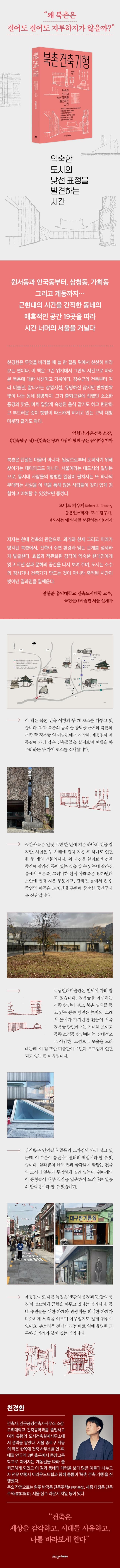 저자는 때로는 건축가의 시선으로, 때로는 동네에 거주하는 생활인의 감각으로 건물과 사람, 풍경을 연결한다. 공간에 대한 탐구는 건물을 만든 사람들, 풍경 속에서 살아가는 사람들의 이야기로 귀결된다. 북촌은 단절된 작은 관광지가 아니라 사람들의 일상이 일어나는 무대다. 건축가의 손에서 탄생하고 고쳐지고 세월이 흐르면서 몸집을 불리거나 일부를 허문 건물 이야기와 더불어 건물을 드나들거나 옆에서 변화를 지켜보는 사람들의 이야기는 무심히 지나치는 건물과 동네를 재발견하는 기회를 선사한다.