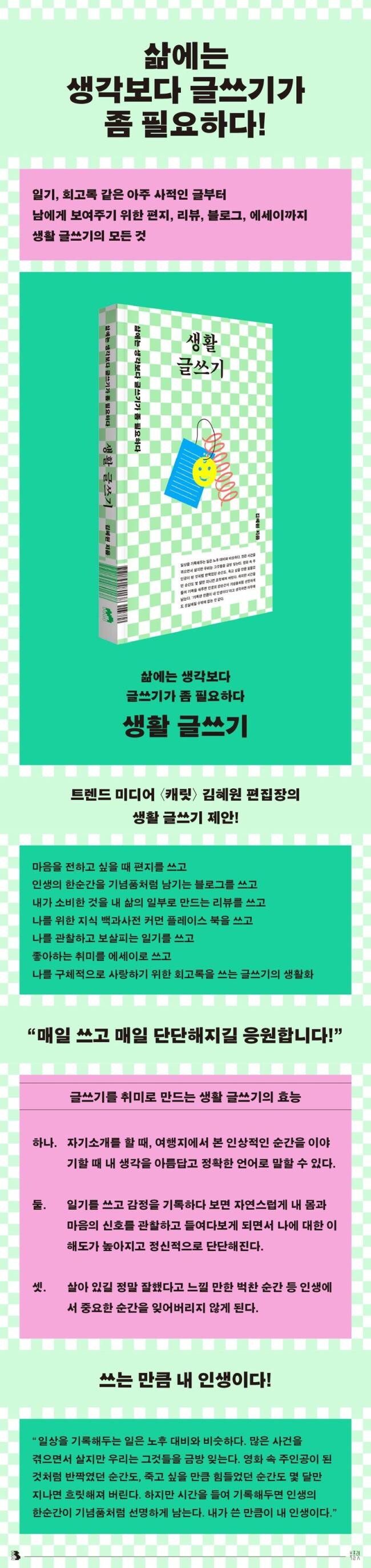 AI가 글을 대신 써주는 시대다. 자기소개서는 물론 이메일과 보고서, 홍보 문구까지 몇 초 만에 완성된다. 그런데 아이러니하게도 최근에는 짧고 빠른 콘텐츠 대신 긴 호흡의 글쓰기를 선택하는 사람들이 늘고 있다. 블로그와 기록 플랫폼을 중심으로 일상을 남기고 회고하는 움직임이 확산되며, 단순한 정보 공유를 넘어 자신의 하루와 생각을 묶어두는 ‘기록의 가치’가 다시 주목받고 있다. 이러한 흐름 속에서 기록이 지닌 본래의 의미를 가장 선명하게 드러내는 글쓰기가 있다. 바로 일기다. 일기는 누군가를 설득하기 위한 글도, 잘 쓰기 위한 글도 아니다. 하루의 감정과 생각, 흔들림과 망설임이 쌓여 만들어지는 기록이다. 트렌드 미디어 〈캐릿〉의 김혜원 편집장이 쓴 《생활 글쓰기》는 바로 이 지점에서 출발한다. 이 책은 글쓰기를 기술이나 성과의 문제가 아니라, 내가 살아온 시간을 놓치지 않고 붙잡아두는 방법으로 제안한다. 저자는 “하루에 한 문단이라도, 한 문장이라도 쓰기 위해 루틴을 만들고, 조금 더 쉽게 글쓰기라는 유용한 취미를 연구”해온 것들을 이 책에 담아냈다.