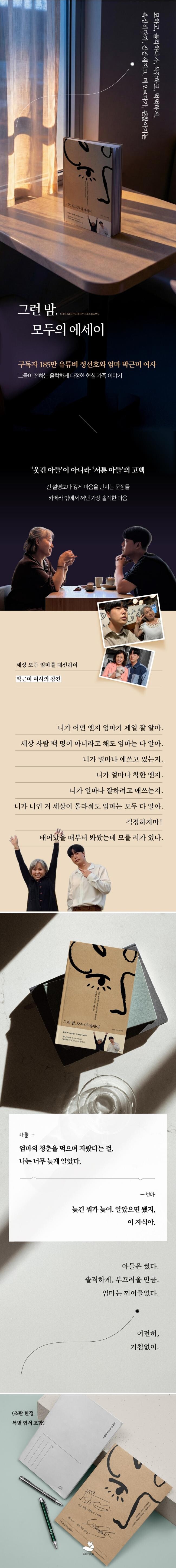 그녀의 한마디 한마디에서 내 부모, 내 엄마가 떠오르는 말할 수 없는 찡한 순간들. 그 한 번의 순간이 이 책이 노린 바로 그것이 적중한 순간이 된다. 아들은 솔직하게 부끄러울 만큼. 엄마는 거침없이 끼어든 이 글들이 누군가의 책장 한편에 꽂혀 어느 날 펼쳐지기를 바란다.