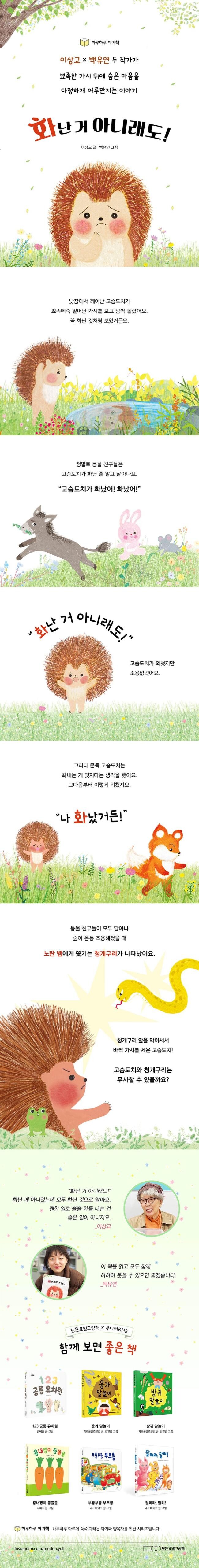 《화난 거 아니래도!》에는 다양한 동물들이 등장한다. 주인공 고슴도치를 비롯해 생쥐, 토끼, 당나귀, 곰, 악어, 여우, 오리 가족, 뱀, 청개구리까지! 크고 작은 숲속 동물들이 차례대로 등장하여 단순한 먹이사슬 구조를 보여 주고, 위기에 처한 친구(동물)를 돕는 이야기로 자연 생태계를 자연스럽게 익히도록 한다. 이 모든 장면들이 백유연 작가의 따뜻한 감성이 돋보이는 화사한 그림으로 구현되어 더없이 귀엽고 사랑스러운 그림책으로 완성되었다. 화난 것처럼 감정을 끌어올려 울그락불그락해지는 고슴도치의 모습에 책을 읽는 모두가 미소 짓게 된다. 마지막 장면에서는 모두 함께 하하하 웃게 되는 그림책이다.