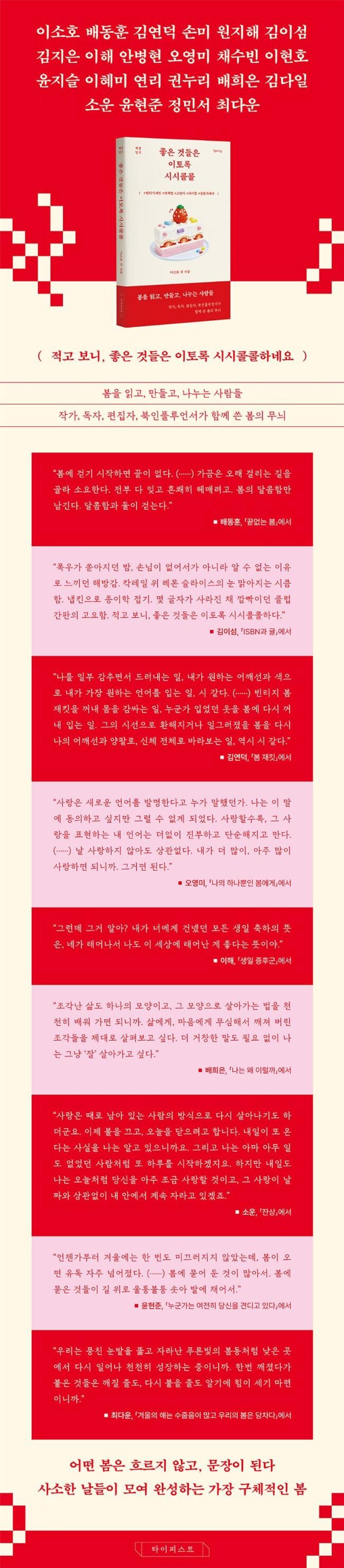 내밀한 각자의 방에서 쓰인 이 이야기들이 책이라는 문을 열고 바깥세상으로 나간다. 남의 일기장을 훔쳐보는 짜릿한 즐거움 끝에, 우리는 결국 자신의 지난봄을 마주하게 될 것이다. 『좋은 것들은 이토록 시시콜콜』은 ‘봄(spring)’과 ‘봄(seeing)’에 관한 책이자, ‘바라봄’에 관한 책이다. 타인의 일기장 너머로 흐르는 봄을 보고, 그에 흔들리는 마음을 보고, 마침내 자신의 봄을 바라보게 될 것이다. 잠시 숨을 고르면 ‘바라봄’은 곧 ‘바라, 봄’, 즉 우리 곁에 따뜻한 봄이 오기를 바라는 기도가 되기도 할 테다. 스물두 명의 우리가 각자의 방식으로 앓고, 견디고, 사랑하며 통과한 이 봄의 기록이 당신의 봄에 봄바람 같고 봄비 같은 안부로 가 닿기를 바란다.
