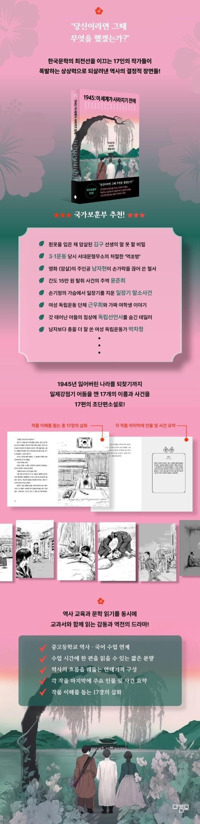《1945: 이 세계가 사라지기 전에》는 피 튀기는 무장투쟁과 암흑 같은 옥중의 시간, 일제강점기의 치욕적인 일상을 오가며, 1945년 광복에 이르는 저항의 연대기를 촘촘히 엮어낸다. 한 편 한 편은 독립된 이야기이지만, 함께 읽을 때는 역사적 사건과 사건 사이를 오가며 스스로 의미를 연결하는 과정을 통해 역사 교육과 문학 읽기를 동시에 성립시키는 드문 성과를 보여준다. 이러한 방식으로 이 책은 중고등학교 역사 및 국어 교과서와 함께 활용할 때 그 의미가 더욱 확장된다.