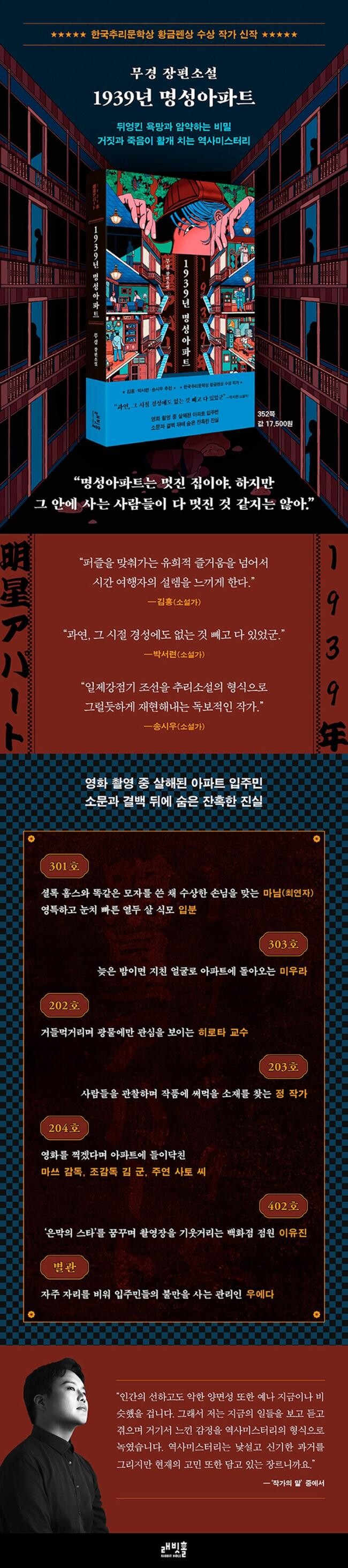 제2차 세계대전이 일어나기 직전이었던 1939년 여름은 언제든 평화가 무너질 수 있다는 불안과 흉흉함이 만연한 때였다. 전작에서 주로 근대 부산의 특별한 정취가 돋보이는 미스터리를 발표했던 무경은, 이번 작품에선 1939년 경성으로 무대를 옮겨 미스터리의 긴장감을 한층 더 높이는 탁월한 방식을 선택한다. 여기에 당시 본격적으로 들어서기 시작한 독신자아파트의 공간적 특징을 디테일하게 활용해 미궁에 빠진 사건을 추리해나가는 설정은 색다른 재미를 더하며 잔혹함이 서린 아파트 곳곳으로 독자들을 안내한다. 기존 미스터리 독자들에겐 완성도 높은 한국형 미스터리를 만끽하는 즐거움을, 미스터리가 생소한 독자들에겐 짜릿한 지적 쾌감을 선사하는 본격 미스터리의 세계로의 첫 걸음이 될 것이다.