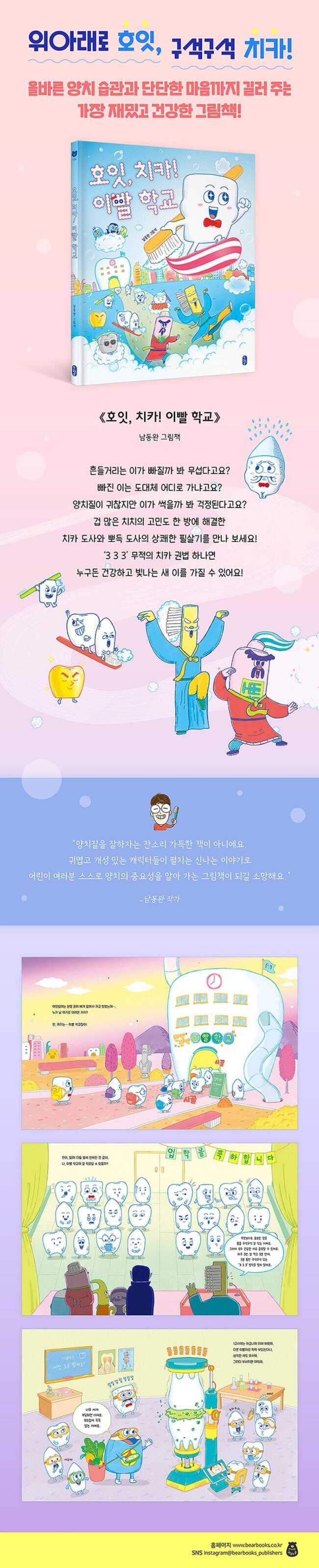 남동완 작가는 두 아이를 키우며 세상에서 제일 귀찮고 지겨운 숙제인 양치가 조금이라도 즐거운 놀이가 되길 바라는 아빠의 마음으로 이 이야기를 만들었다고 합니다. 그래서인지 책장을 한 장 한 장 넘길 때마다 곳곳에서 열심히 궁리한 흔적들이 보입니다. 학교 건물은 튼튼한 어금니 모양이고 선생님은 모두 양치 도구에서 착안한 캐릭터들입니다. 겁 많고 소심한 주인공 치치가 학교에 적응해 가고 급기야 위기에 처한 친구들을 구해내는 모습은 유치원이나 초등학교 입학을 앞둔 어린이들에게 커다란 격려가 되어 줍니다. 또한 다른 이들보다 느리게 자라는 사랑니 교실에서는 저마의 속도와 다름을 존중하는 따뜻한 시선도 느껴집니다.
