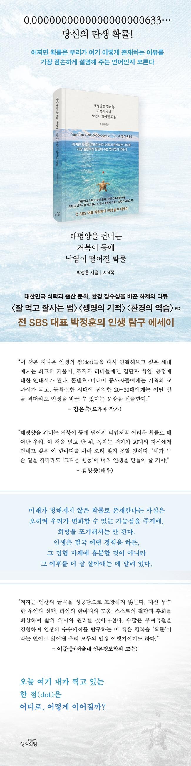 이 책의 제목은 하나의 통계적 비유이자, 저자의 고백과 같다. 태평양을 건너는 거북이 등에 낙엽이 떨어질 확률처럼, 지금 여기에 우리가 존재한다는 사실은 그 가능성 자체가 제로에 가깝다는 자각에서 이야기는 시작된다. 저자는 자신의 출생 확률을 계산해본다. 부모님의 만남부터 수정과 착상, 세상에 나올 확률까지, 이 모두를 곱한 숫자는 “0.0000000000000000000633”. 소수점 뒤에 0이 19개나 붙는, 사실상 0에 수렴한다. 저자는 여기에 어머니로부터 직접 듣게 된 “낙태약을 먹고도 떨어지지 않았던 아이”가 자신이었다는 충격적인 고백까지 더하며, 이 숫자를 냉정한 계산이 아닌 경외의 언어로 바꾸어 놓는다.