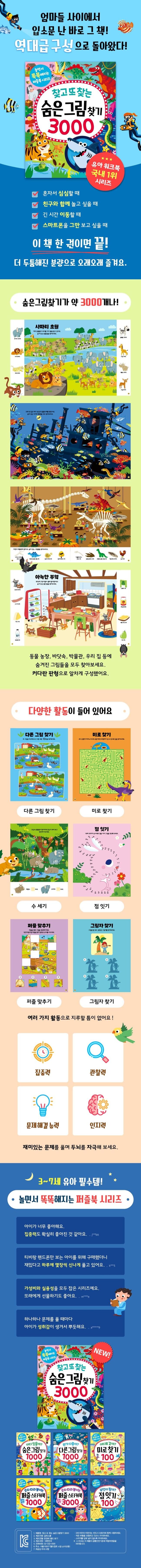 동물 농장, 바닷속, 정글, 공룡 시대, 박물관, 우리 집 등 아이가 호기심을 가질 만한 크고 멋진 장면 안에 찾아야 할 그림들이 여기저기 숨어 있어요. 유심히 들여다보며 그림을 찾다 보면 집중력, 관찰력, 창의력이 쑥쑥 자라나요. 양이 정말 넉넉해서 혼자 마음껏 풀어도 재미있고, 친구나 가족과도 머리를 맞대고 함께 할 수 있어요. 숨은 그림을 다 찾으면 즐거움과 성취감은 물론, 쌓였던 스트레스까지 해소될 거예요.