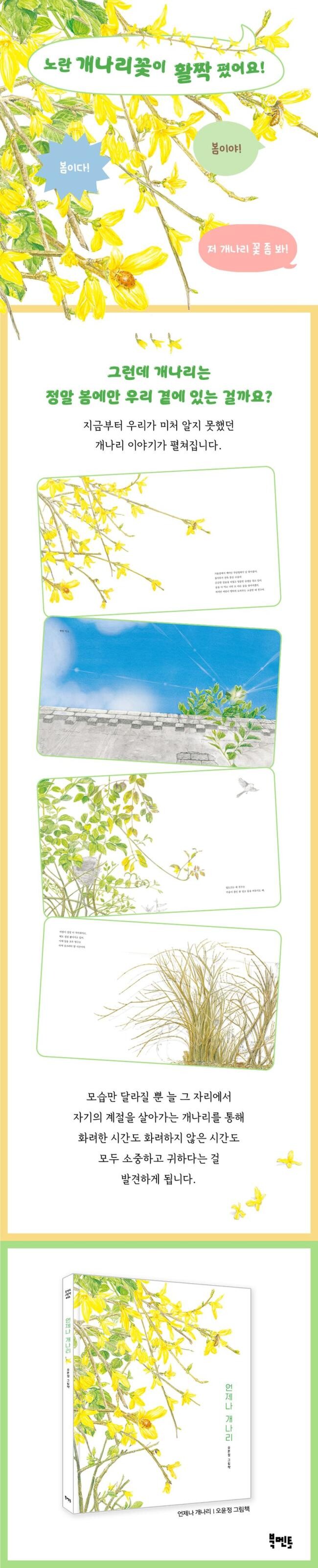 《언제나 개나리》에는 개나리 곁에서 실제로 함께 살아가는 식물과 곤충, 새들이 세심하게 그려져 있어요. 아이들은 그림을 따라가며, 개나리가 혼자 서 있는 것처럼 보여도 사실은 많은 생명과 함께 살아가고 있다는 걸 알게 되지요. 그림책의 마지막에는 그림책에 등장하는 동식물에 대한 설명을 실어서, 그림책에서 만난 동식물에 대해 조금 더 깊이 알게 했어요. 이 그림책을 통해 아이들은 개나리뿐만 아니라 모든 생명이 홀로 살아가는 것이 아니라 서로 기대고 이어져 살아간다는 사실을 자연스럽게 느끼게 될 거예요. 《언제나 개나리》와 함께 우리 주변의 동식물을 찬찬히 관찰하며, 함께 살아가는 모든 생명을 소중히 여기는 마음을 키워 보세요.