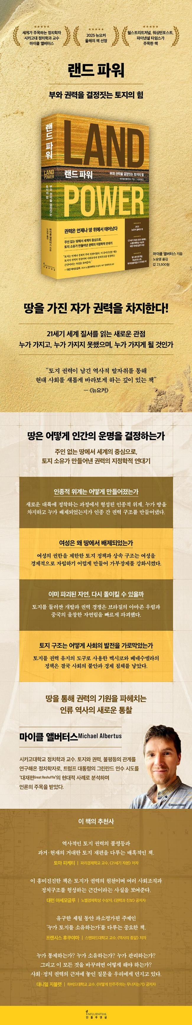 이처럼 《랜드 파워》는 토지 재분배가 설계 방식에 따라 안정과 성장의 토대가 되기도, 또 다른 불안정을 발생시키기도 했다고 설명한다. 토지가 사회적 위계와 정치적 질서를 만들어내는 가장 오래되고도 강력한 권력의 장치임을 다양한 사례를 통해 입증한다.
