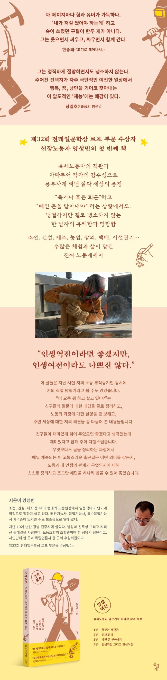 노동이라는 “삶의 현실”을 기본으로, “정직하게 절망”하면서도 자신의 삶을 긍정하고 희망과 행복을 말하는 유쾌함과 명랑함은 결국 “여전할 때도 마찬가지로” 나쁘지 않은 인생으로 이어진다. 육체노동을 본업으로 하면서도 (굳이 출판을 전제하지 않은) 글쓰기를 계속해 온, 앞으로도 그리 살아갈 아마추어 작가의 첫 책은 특유의 독특함으로 우리에게 신선한 자극을 준다. 명랑하면서도 유쾌한 새로운 작가의 탄생은, 곳곳에 숨어 있을 “1500만 개의 노동일기”를 예비한다. 누구나 나의 삶을 기록하고, 우리의 삶을 고민하고, 함께 읽고 함께 쓰는 일상 속의 풍부한 아마추어의 세계 확장은, 곧 우리 모두의 세계와 지평을 건강하게 확대하는 것이다. ‘읽으면 읽을수록 보약을 먹은 듯한’ 건강한 느낌을 주는, ‘여전한 지금의 인생’을 끝내 긍정하는 책 양성민의 『인생여전』을 많은 독자와 함께 하고 싶은 이유다.