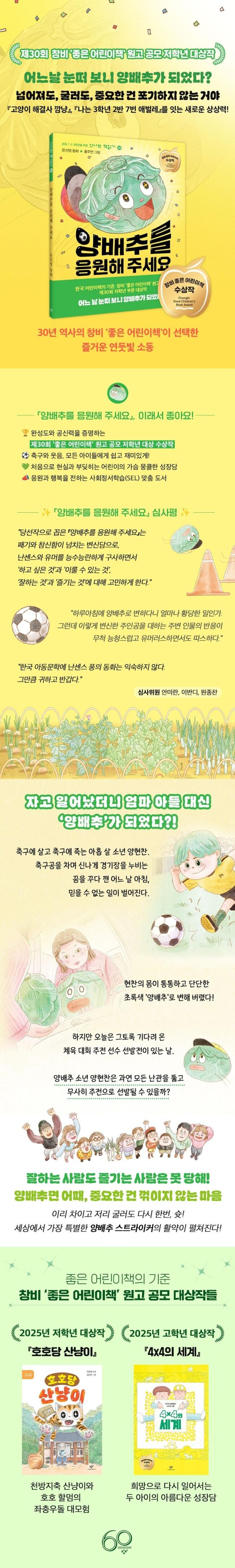 『양배추를 응원해 주세요』는 “패기와 참신함이 넘치는 변신담”이라는 찬사를 받으며 제30회 창비 ‘좋은 어린이책’ 저학년 부문 대상을 수상했다. 축구 선수를 꿈꾸는 ‘양현찬’이 어느 날 갑자기 양배추로 변하며 벌어지는 일을 다루는 이 작품은 기상천외한 설정에서 출발해 묵직하고 단단한 어린이의 내면으로 가닿는다.
