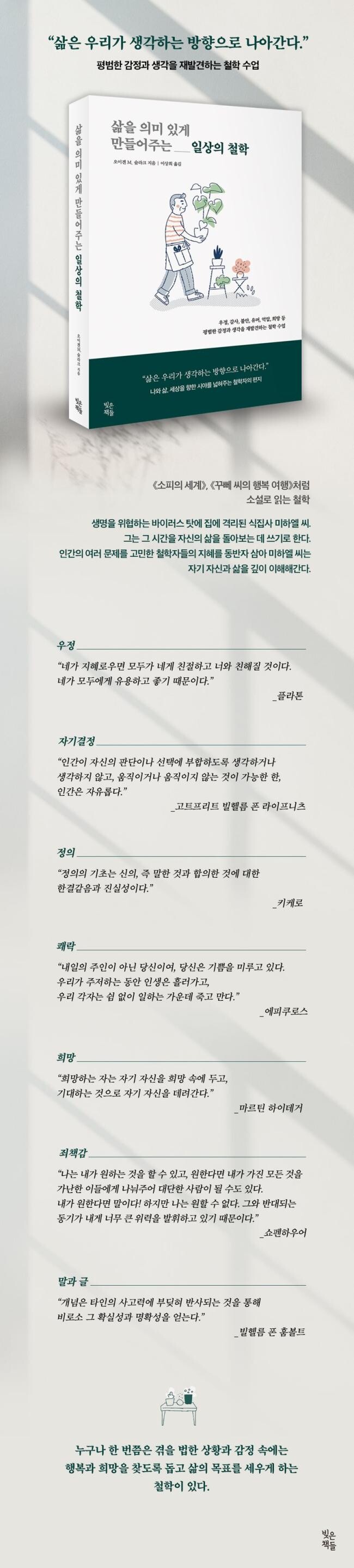 식물에게만 애정을 쏟으며 살아왔던 주인공 미하엘 씨가 50여 일의 격리 기간을 의미 있게 보내려고 철학자에게 메일을 보내며 시작하는 《삶을 의미 있게 만들어주는 일상의 철학》. 소설처럼 읽을 수 있는 이 책은 철학사나 복잡하고 어려운 철학 이론 대신 우리가 공감하고 이해하기 쉬운 주제를 다루고 있다.