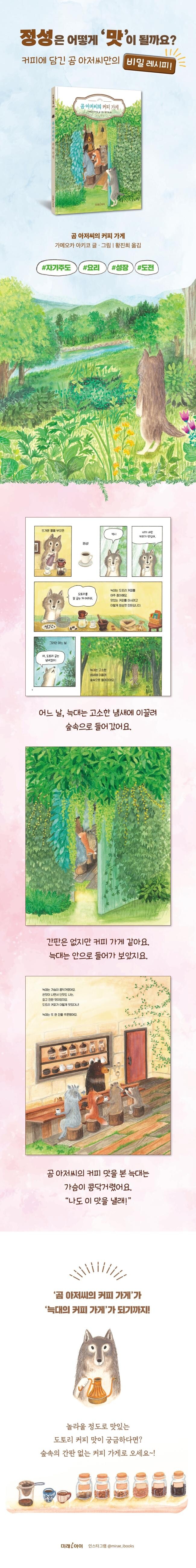『곰 아저씨의 커피 가게』는 단순한 ‘커피 이야기’를 넘어, 하고 싶은 일을 자기만의 방식으로 이루어 나가는 주인공의 모습으로 진정한 성장이란 무엇인지 떠올려 보게 합니다. 여기에 부드럽고 따뜻한 느낌의 수채화와 만화 형식의 대사가 어우러져, 글 읽기를 막 시작한 아이들도 배우고 성장하는 즐거움을 자연스럽게 보고 느낄 수 있어요. 또 한 장 한 장 책장을 넘기다 보면 언젠가 자기가 좋아하는 것을 정성껏 만들어 보고 싶은 마음이 슬며시 자라날 거예요.