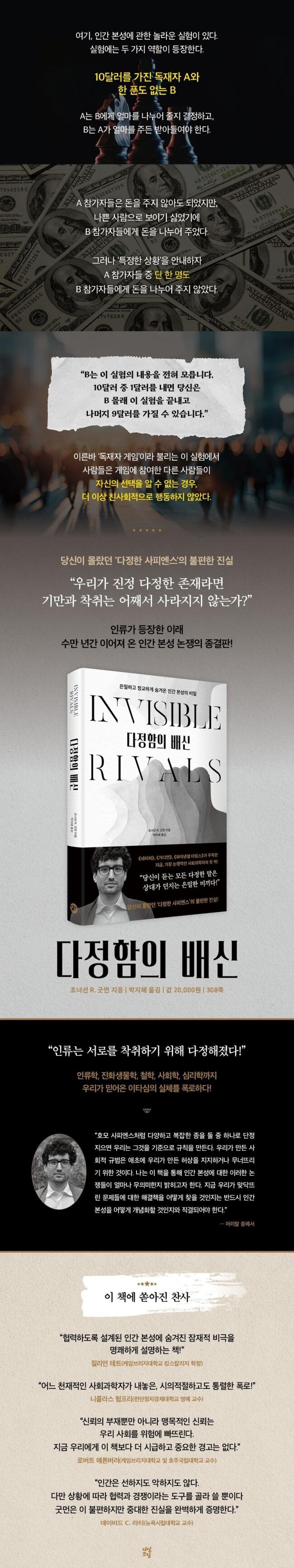 『다정함의 배신』은 생존을 위해 발달시킨 다정한 협력의 기술이 사실은 타인을 속여 자원을 선점하고자 했던 ‘보이지 않는 경쟁’의 산물이었음을 논리적으로 증명해 나간다. 이타심이 때로 미덕을 과시하거나 보이지 않는 경쟁과 기만, 착취를 감추는 수단이었다는 사실을 뒷받침하기 위해 저자는 수렵 채집 사회의 부족들을 관찰한 민족지학 연구, ‘독재자 게임’, ‘죄수의 딜레마’ 등의 심리 실험과 인간 본성을 둘러싼 홉스와 루소의 주장까지 다양한 학문을 가로지르며 풍부한 사례들을 담아냈다. 또한 인간 본성의 진화가 단순한 생물학적 기제가 아니라 일종의 전략이었다는 그의 통찰은 『네이처』, 『가디언』, 『파이낸셜 타임스』, 『뉴 사이언티스트』, 『사이언티픽 아메리칸』 등 유수 매체들에도 기고되었다.