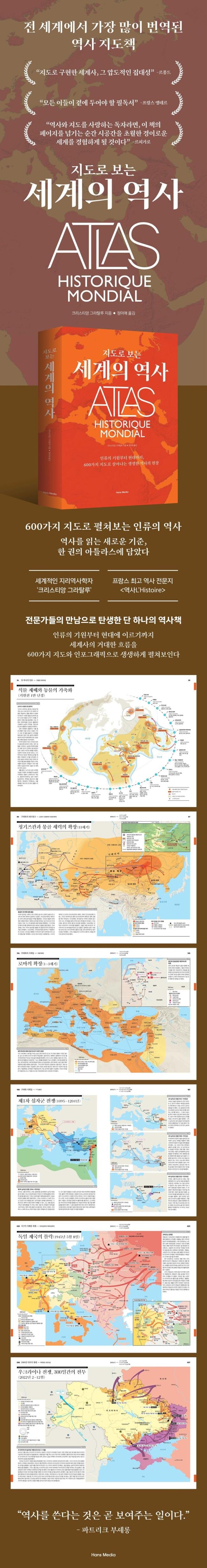 이 아틀라스는 인류의 역사를 ‘지도’라는 구체적인 현장으로 불러온다. 지도 위에 펼쳐진 역사는 눈앞에서 펼쳐지듯 생생하게 전개되어 한 줄의 글로 다 설명되지 못하는 지리적 조건과 사건의 흐름을 설명한다. 인류가 지구 곳곳으로 퍼져 나간 여정부터 오늘날의 기후 변화까지 시간과 공간을 넘나들며 역사를 조망한다.