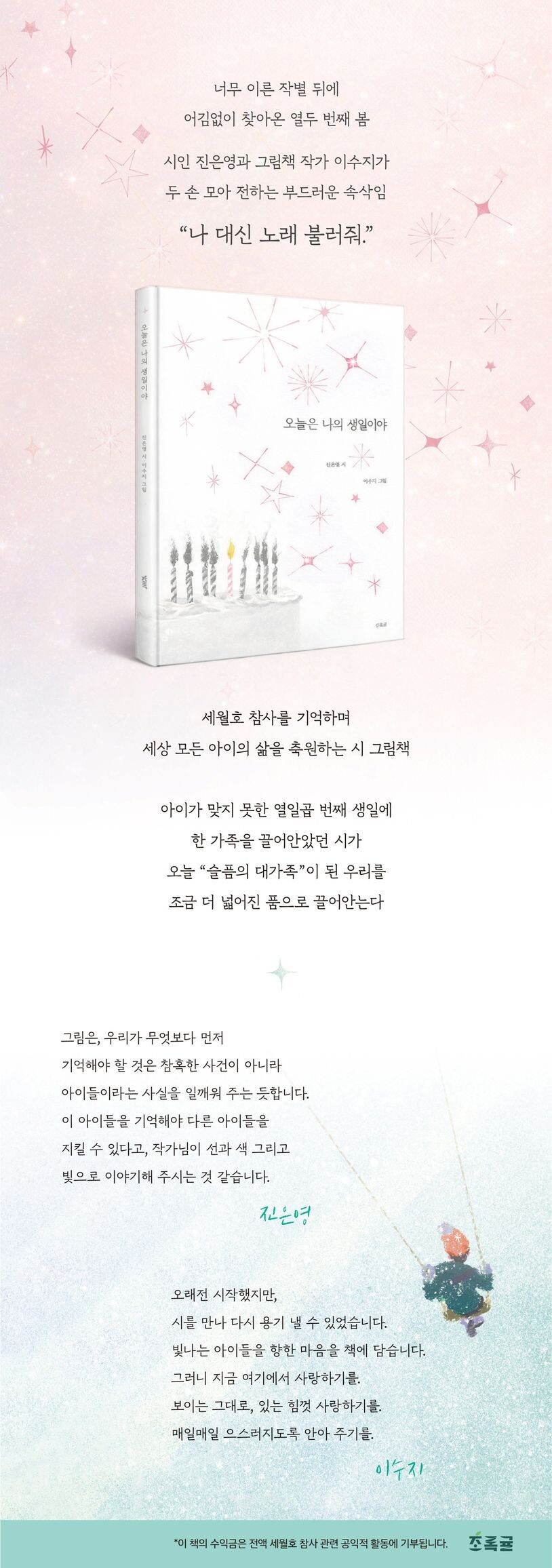 가혹한 사건을 기억하는 일이 너무 힘들어서 우리는 자꾸 잊으려 합니다. 이수지 작가님의 그림은, 우리가 무엇보다 먼저 기억해야 할 것은 참혹한 사건이 아니라, 아이들이라는 사실을 일깨워 주는 듯합니다. 노래를 잘 부르던 아이, 농구에 열심이던 아이, 무서울 때면 언니 손을 꼭 잡았던 아이…… 모든 아이가 사랑스럽고 아름답습니다. 이 아이들을 기억해야 다른 아이들을 지킬 수 있다고, 작가님이 선과 색 그리고 빛으로 이야기해 주시는 것 같습니다.