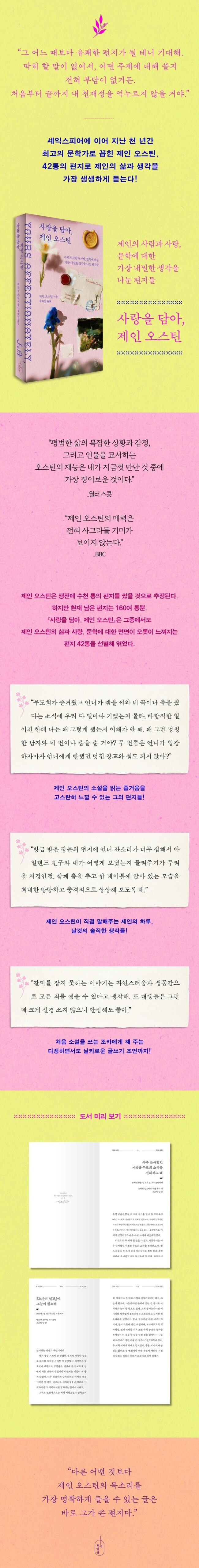 제인 오스틴은 18세기 후반에서 19세기 초 영국의 사회상, 특히 운신의 폭이 자유롭지 못했던 여성들의 삶과 제약, 개인적인 갈등을 독창적이면서 재치 있는 문체로 풀어내 수백 년 동안 전 세계의 독자들의 사랑을 받았다. 작가 특유의 재치를 잃지 않으면서도 날카롭게 정곡을 찌르는 인간 심리에 대한 신랄한 통찰은 제인의 문학에서 특히 빛나는 지점인데, 이는 그의 편지에서도 오롯이 느껴져 읽는 재미를 더한다. 이 편지들을 통해서 제인 오스틴의 작품 세계의 씨앗을 엿볼 수 있어, 제인 오스틴과 그의 문학을 사랑하는 ‘제이나이트’는 물론, 제인 오스틴의 소설을 재미있게 본 모든 독자들, 리젠시 시대에 관심 있는 이들에게도 모두 의의 있는 책이 될 것이다.