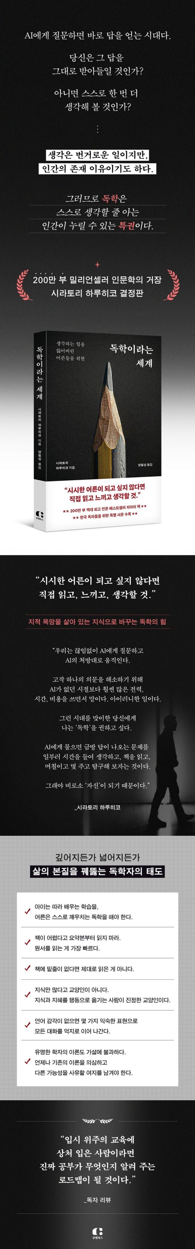 이 책은 AI 시대를 맞이한 현대인들에게 ‘독학’을 권한다. 독학은 자신의 의지로 끝까지 파고들어 보는 경험이다. 이 책의 저자 시라토리 하루히코는 특별 서문을 통해 ‘AI에게 물으면 금방 답이 나오는 문제’를 일부러 시간을 들여 생각하고, 어려운 책을 해설서 없이 읽고, 답이 바로 나오지 않더라도 며칠이고 몇 주고 스스로 탐구해 볼 것을 제안한다. 스스로 생각할 줄 아는 힘은 가장 인간적인 능력이며, 자신만의 관점을 세워 가는 과정을 거쳐야 단단한 내면이 완성되기 때문이다. 사고의 힘은 비로소 자신답게 살아갈 수 있는 원동력이 된다.