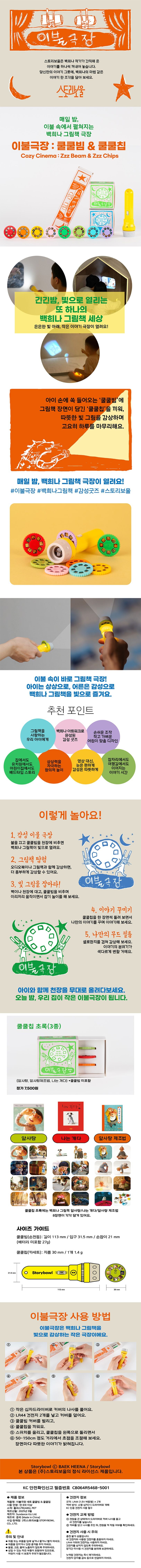 아이 손에 쏙 들어오는 ‘쿨쿨빔’에 그림책 장면이 담긴 ‘쿨쿨칩’을 끼워, 따뜻한 빛 그림을 감상하며 고요히 하루를 마무리해요.