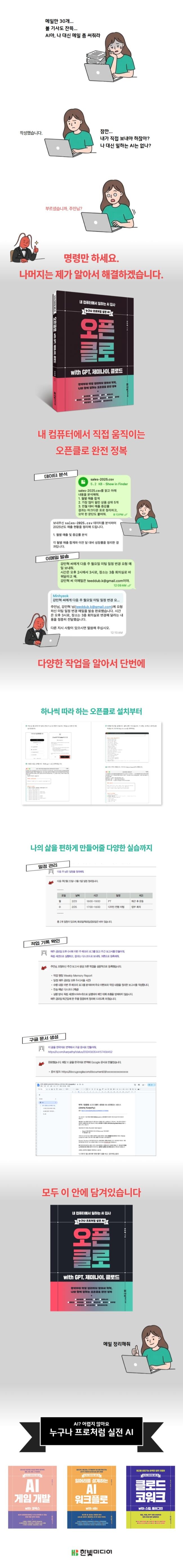 이 책은 에이전트의 탄생부터 독립까지 전 과정을 다룹니다. PART 01에서 AI 에이전트 개념을 잡고 맥·리눅스·윈도우 환경에 설치합니다. 터미널이 부담스러운 독자를 위해 브라우저에서 바로 시작하는 키미클로도 소개합니다. PART 02에서 토큰 비용 관리, 보안 설정, 에이전트 성격 부여, 첫 업무 지시까지 마칩니다. PART 03에서 자동 실행 예약, 브라우저 제어, 지메일·슬랙·구글 캘린더·노션·구글 독스 연동까지 확장합니다. 프로바이더별 API 키 발급부터 비용을 아끼는 모델 선택 전략까지 실무적인 부분도 놓치지 않았습니다. 7장과 8장에서는 여러 에이전트를 동시에 운영하는 멀티 에이전트 구성, 스킬을 통한 외부 서비스 연동 같은 심화 주제도 다룹니다. 이미 AI 도구를 쓰고 있는 독자라면 이 구간에서 오픈클로만의 확장성을 확인할 수 있을 것입니다.