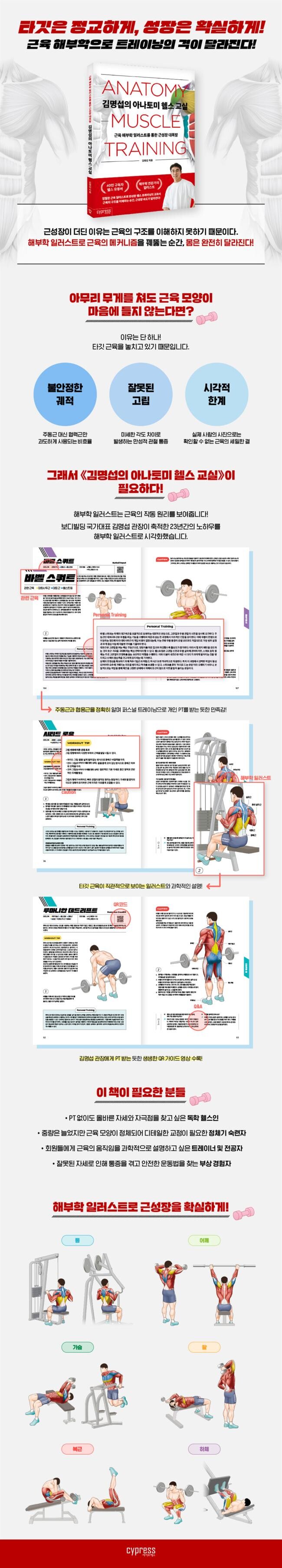 웨이트 트레이닝 시장에 수많은 정보가 넘쳐나지만, 여전히 많은 이들이 부상에 시달리고 정체기에 머물러 있다. 출판사는 그 해답을 ‘근육의 구조를 정확히 아는 것’에서 찾았다. 전작 『김명섭의 헬스 교실』이 보디빌더의 경험과 이론을 대중에게 소개하는 데 집중했다면, 신작 『김명섭의 아나토미 헬스 교실』은 이론을 시각적으로 완벽히 구현해 낸 ‘헬스 트레이닝 교과서’ 결정판이라 할 수 있다.