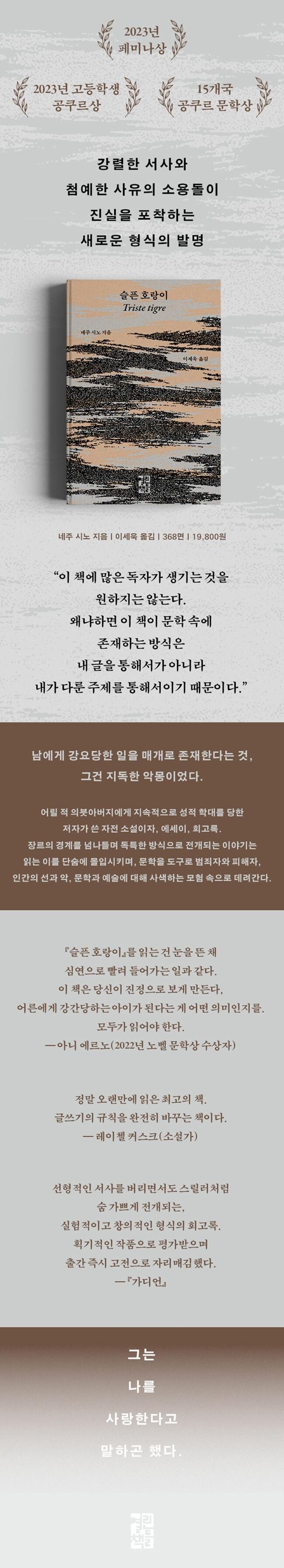 획기적인 형식과 강렬한 서사로 출간 직후 문학계를 뒤흔든 네주 시노의 『슬픈 호랑이』가 열린책들에서 출간되었다. 프랑스 4대 문학상인 페미나상과 고등학생이 직접 선정하는 공쿠르상을 비롯해 전 세계적으로도 수많은 문학상을 휩쓴 이 작품은, 어릴 적 의붓아버지에게 지속적으로 성적 학대를 당한 저자가 쓴 자전 소설이자, 에세이, 회고록이다. 저자는 증언 문학이 지닌 기존의 문법을 파괴하고, 여러 장르의 경계를 넘나들며 자기만의 독특한 방식으로 이야기를 전개해 나간다. 읽는 이를 단숨에 몰입시키는 서술과 첨예한 지적 통찰이 함께 소용돌이치는 독보적인 작품이다.