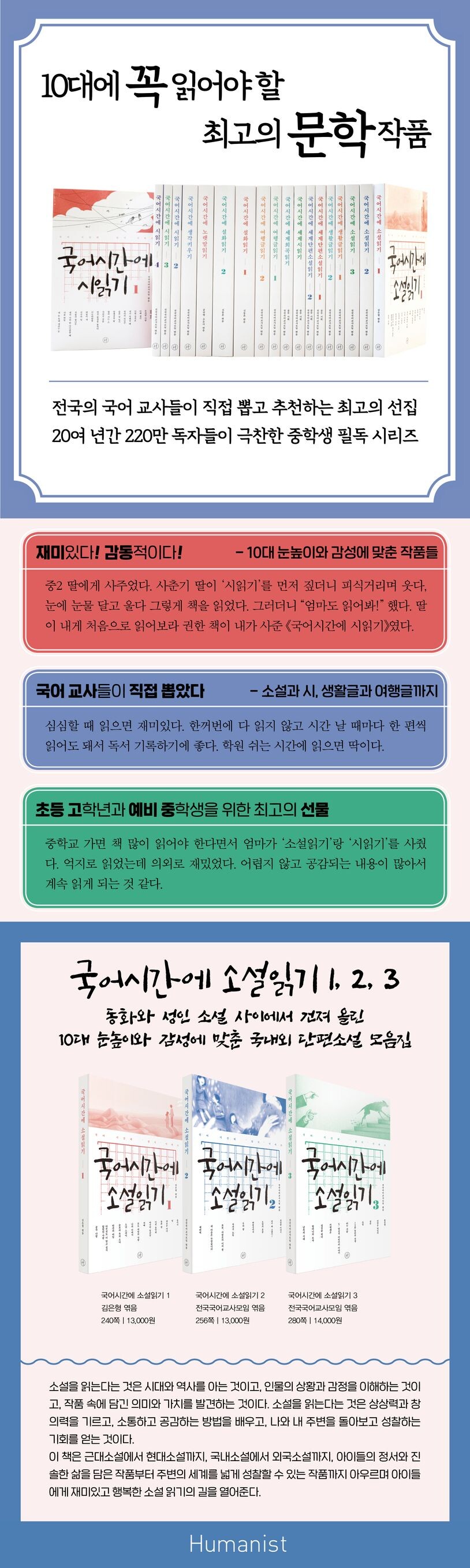 10대 눈높이에 맞춘 최고의 작품들로 엮었습니다- 국어 선생님들이 골라 역은, 학생들의 관심과 흥미에 걸맞은 국내외 단편소설이 책은 시험과 입시를 떠나 신나고 재미있는 국어 수업을 만들기 위해 20년이 넘게 애써온 전국국어교사모임이 펴낸 10대들을 위한 국내외 단편소설 선집이다. 문학을 어려워하고 소설 읽기를 힘들어하는 학생들이 좀 더 문학작품과 가까워지게 하려는 의도로 기획되었다. 학생들이 소설 읽는 재미에 빠지고, 더 나아가서는 스스로 소설을 찾아 읽을 수 있도록 하기 위해서 10대들의 눈높이와 감성을 작품 선정의 가장 중요한 기준으로 삼았다. 그래서 실제로 학생들에게 다양한 소설들을 읽혀보고 학생들 사이에서 반응이 좋았던 작품들을 다수 수록하였다. 동화의 세계에서 갑자기 교과서 속 어려운 소설을 마주해야 하는 중학생들의 눈높이에 맞는 작품들을 골라내어, 소설 읽기의 즐거움을 맛보게 해준다. 1998년 초판이 발행된 이후 20여 년간 수많은 독자들에게 사랑을 받아왔으며, 청소년문학 시장에 좀 더 다양한 책들이 나올 수 있게 하는 마중물 역할을 하였다.재미와 감동, 웃음과 눈물이 함께합니다- 교과서에 만날 수 없었던, 나를 돌아보고 세상과 인생을 배울 수 있는 작품들10대 청소년들이 접하는 소설은 대체로 교과서에 실린 작품이거나 몇몇 베스트셀러, 집에서 굴러다니는 오래된 책들이 대부분이다. 학교에서 배우는 소설은 읽고 감상하는 소설이 아니라 말 그대로 ‘배우는’ 소설이다. 그래서 아이들은 소설을 따분한 수업이거나, 시험을 위한 교과서 속 작품 분석 정도로 여긴다. 소설을 읽는다는 것은 시대와 역사를 아는 것이고, 인물의 상황과 감정을 이해하는 것이고, 작품 속에 담긴 의미와 가치를 발견하는 것이다. 소설을 읽는다는 것은 상상력과 창의력을 기르고, 소통하고 공감하는 방법을 배우고, 나와 내 주변을 돌아보고 성찰하는 기회를 얻는 것이다. 그런데 오늘날 현실에서 청소년들에게 소설은 그저 메마른 텍스트일 뿐이다.《국어시간에 소설읽기》는 메마른 학생들의 소설 읽기 밥상에 초점을 맞추어, 신선하고 다양한 작품들을 선사하는 데 주력하였다. 근대소설에서 현대소설까지, 국내소설에서 외국소설까지, 아이들의 정서와 진솔한 삶을 담은 작품부터 주변의 세계를 넓게 성찰할 수 있는 작품까지 아우르며 학생들에게 행복한 소설 읽기의 길을 열어준다. 그리고 전국국어교사모임의 국어 교사들이 머리를 맞대고 뽑아낸 ‘내용 되새기기’, ‘생각해 보기’, ‘더 읽어 보기’ 등은 독자들이 작품 속 세계를 자신의 문제로 받아들이고 공감하며 내면의 힘을 키울 수 있도록 돕는다.《국어시간에 소설읽기 1》에서는 황순원의 <소>, 김유정의 <이런 음악회>, 이태준의 <외로운 아이>, 박완서의 <마지막 임금님> 등 우리나라 대표 소설가들의 알려지지 않은 새로운 작품들을 만날 수 있으며, 중국 연변에서 작품 활동을 하고 있는 동포 작가 김문세, 정영석의 특별한 작품도 만나볼 수 있다. <별>로 친숙한 알퐁스 도데의 또 다른 작품 세계를 엿볼 수 있는 <소년 스파이>, 스위스 현대문학을 대표하는 빅터 픽셀의 개성 넘치는 소설 <아무것도 더 알고 싶지 않은 사람>, 미국 작가 헬렌 그레이엄 레자토의 <눈보라 속의 소녀>, 파멜라 헤넬의 <빈칸의 비밀>, 독일 작가 헤르만 헤세의 <공작 나방> 등 전 세계 곳곳의 소설을 만날 기회도 얻는다.