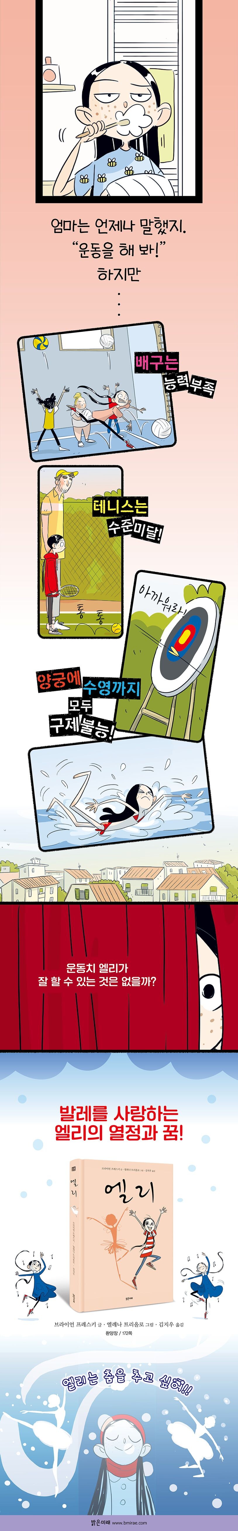 운동이라면 질색하는 운동치 엘리! 엄마가 배구, 테니스, 양궁, 수영까지 온갖 운동을 다 시키지만 엘리에게 느는 건 창피함뿐이다. 그러던 어느 날 우연히 관람한 발레 공연에 엘리는 마음을 빼앗긴다. 하지만 엄마는 발레는 물론 춤이라면 모두 반대다. 발레가 하고 싶은 엘리는 어떻게 해야 할까? 꿈을 위해 엘리에게 필요한 것은 무엇일까?